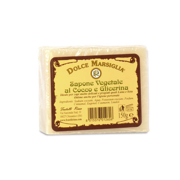 Da una formulazione completamente vegetale, nasce il sapone Dolce Marsiglia cocco e glicerina, prodotto a freddo usando solo ed esclusivamente olio di cocco di prima scelta ricco di glicerina naturale. Viene principalmente impiegato per il lavaggio di tessuti molto pregiati quali seta e lane particolari, ma grazie alla sua morbida schiuma è molto apprezzato anche per l’igiene della persona. Peculiarità unica ed importante di questo sapone vegetale è anche quella di poter schiumare in acqua salata o molto dura, cosa molto difficile da ottenersi per un normale sapone.
